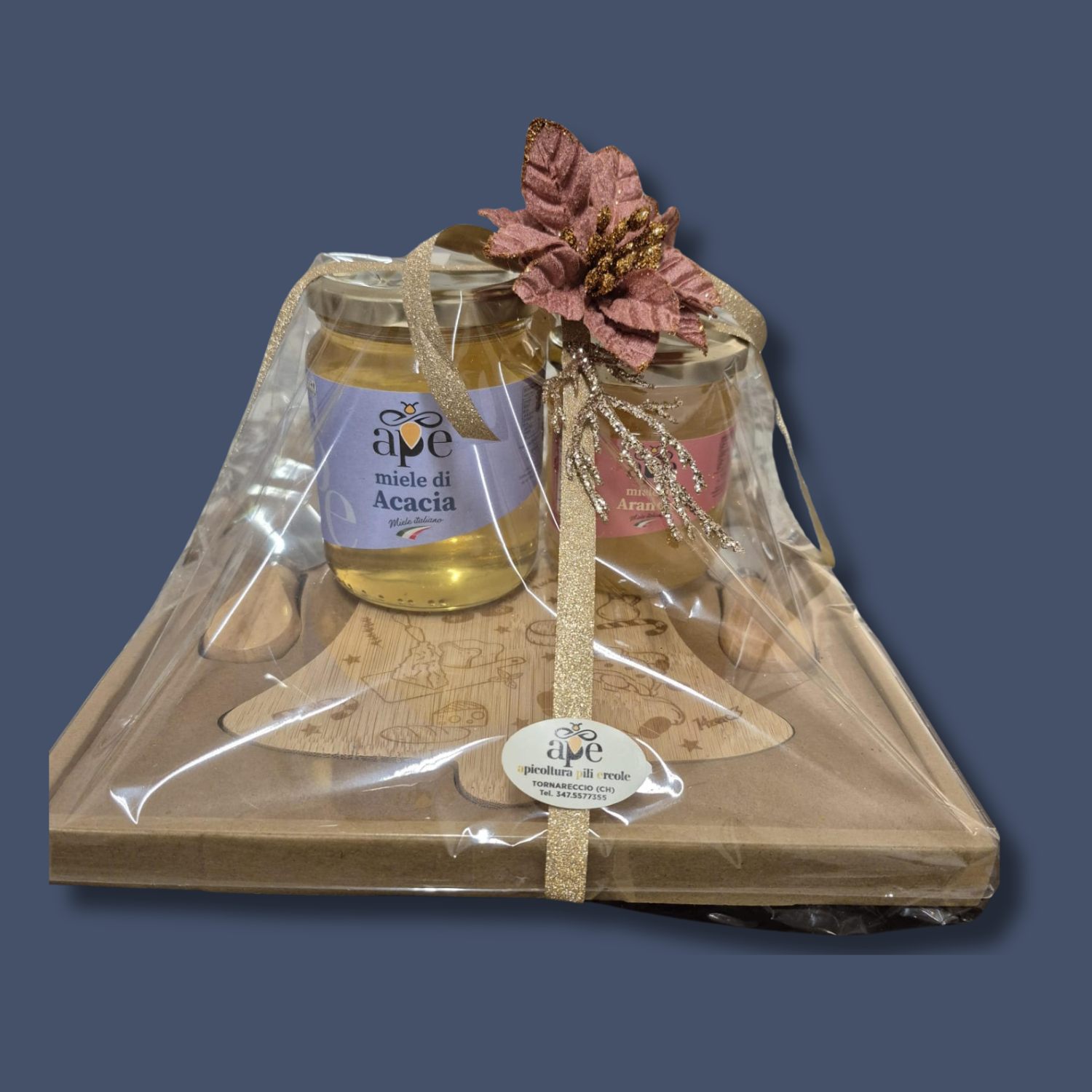 Tagliere in legno con forchetta e cortellino un barattolo di miele di acacia da 500g e un barattolo di arancio da 250g